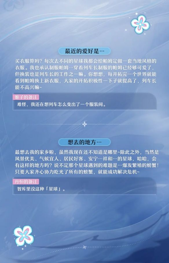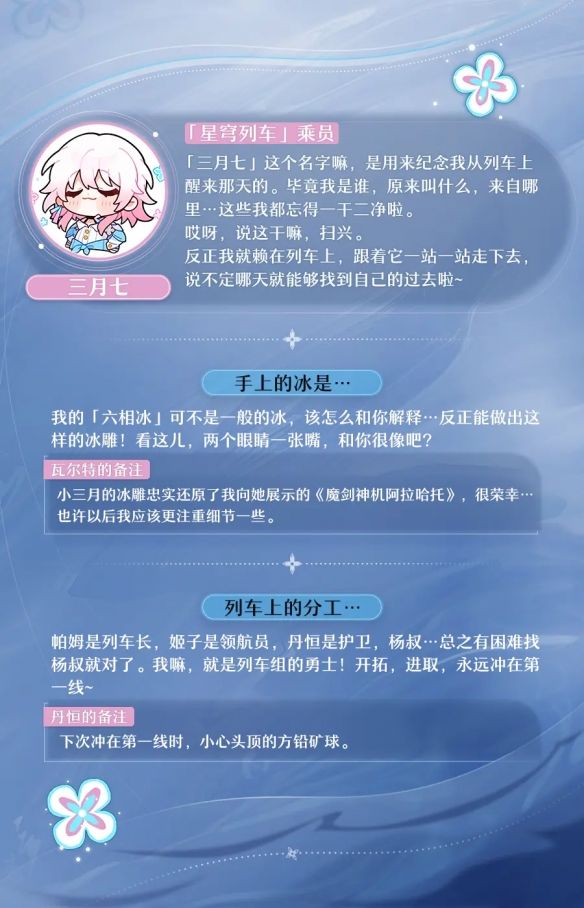 「三月七」这个名字嘛,是用来纪念我从列车上醒来那天的。